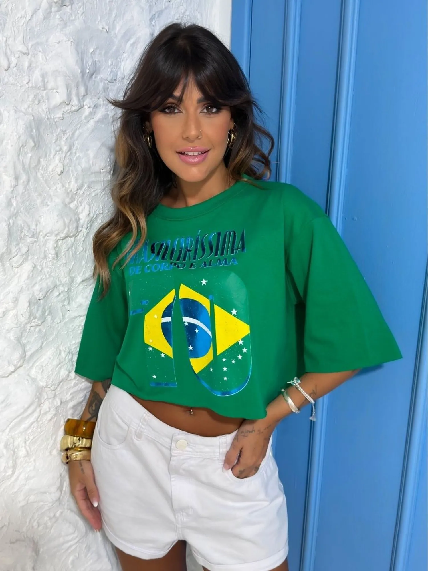 T-shirt Cropped em Algodão, manga curta e estampa.