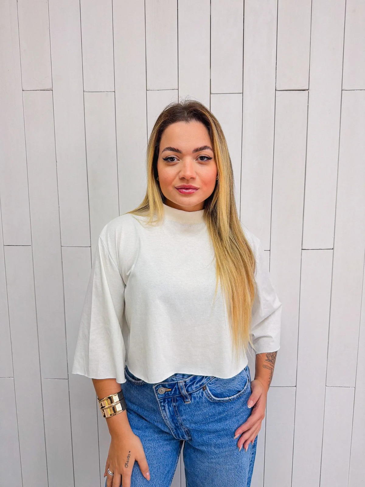 T-shirt Cropped em Algodão, manga curta e gola alta.