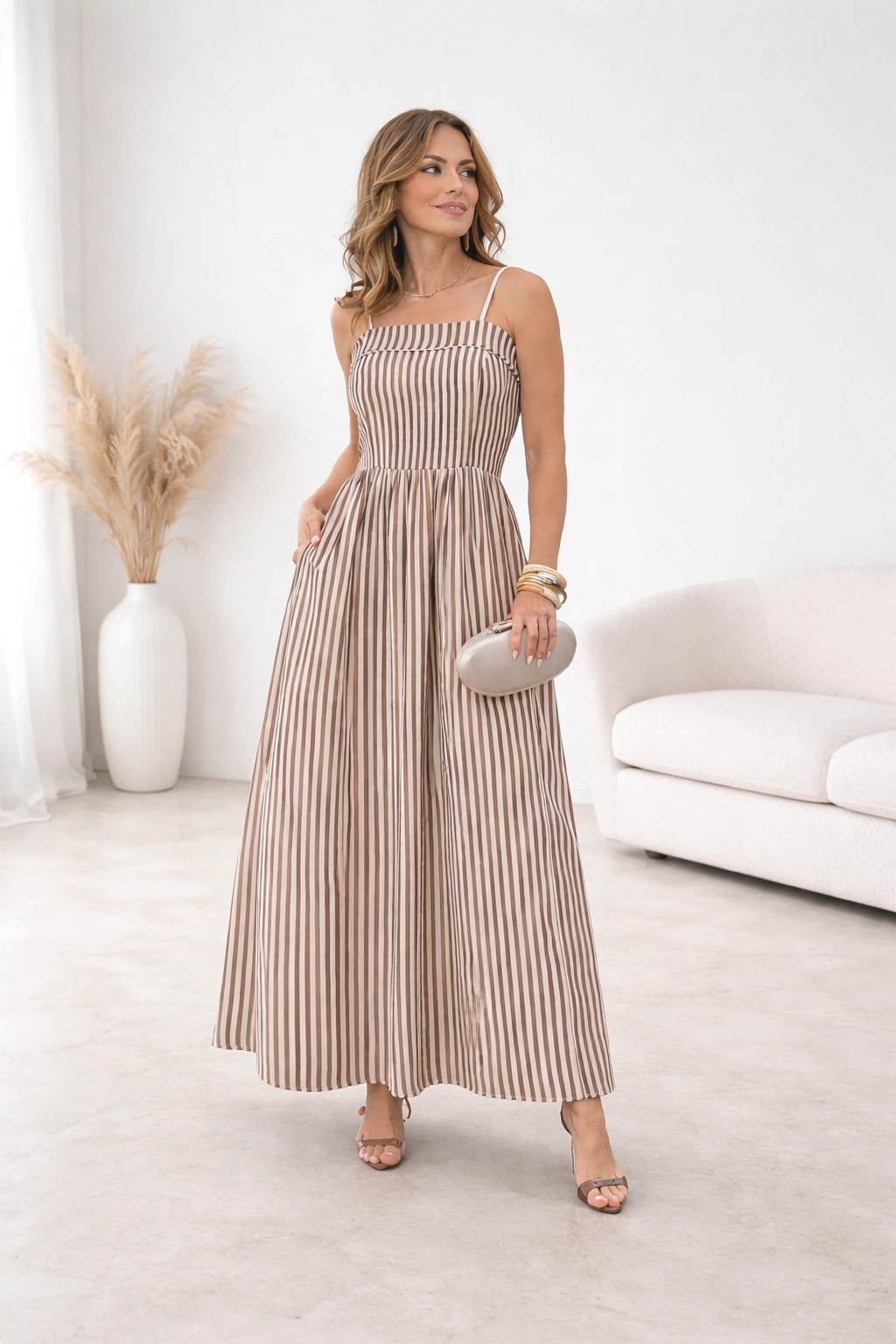 Vestido midi em linho, com bolso frontal e detalhe em pala no decote.