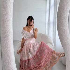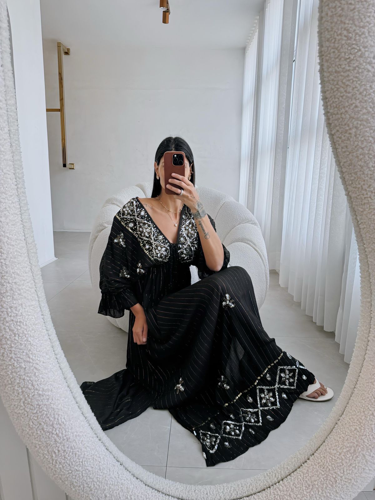 Vestido em algodão forrado, bordado a mão, decote V, manga flare 7/8 e fenda lateral.