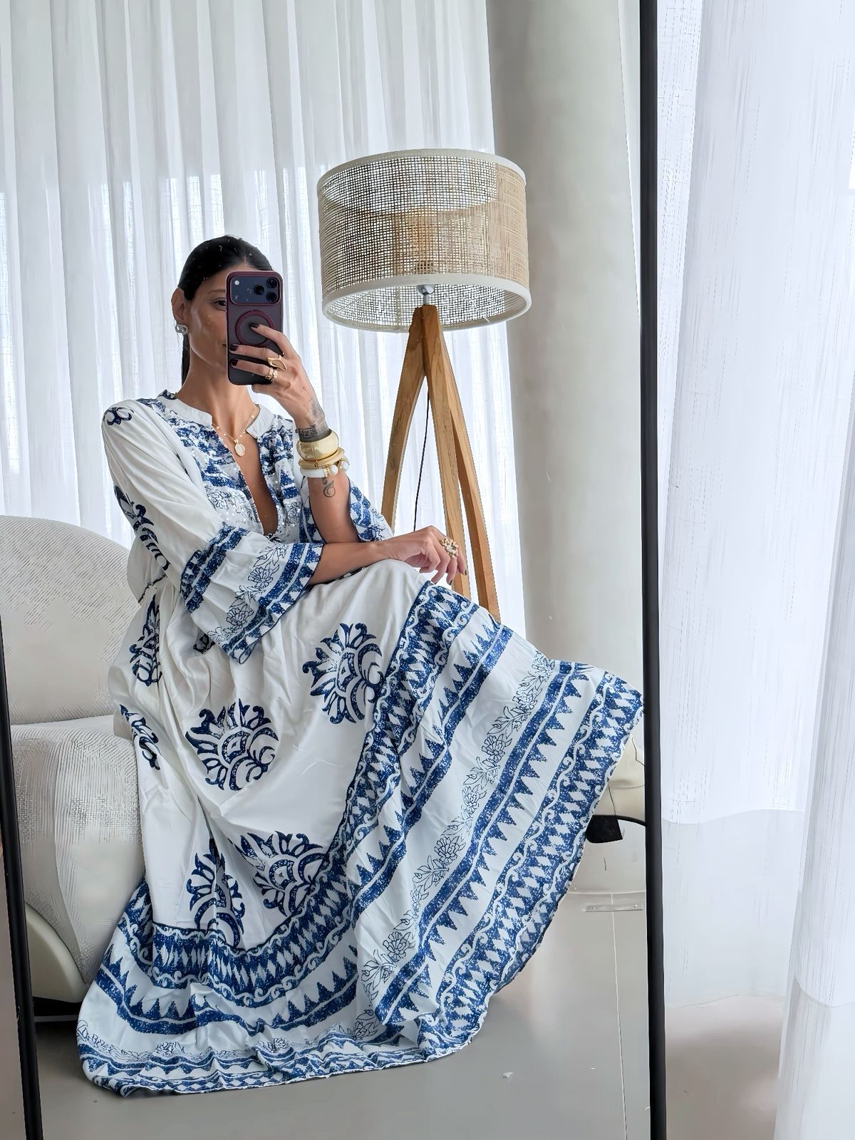 Vestido em algodão forrado e bordados. Comprimento longo, decote V, manga 7/8 e amarração.