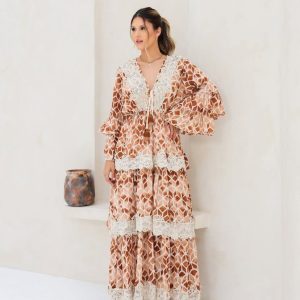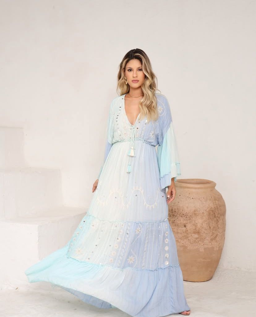 Vestido em algodão forrado e bordado. Comprimento longo, decote V e manga 7/8.