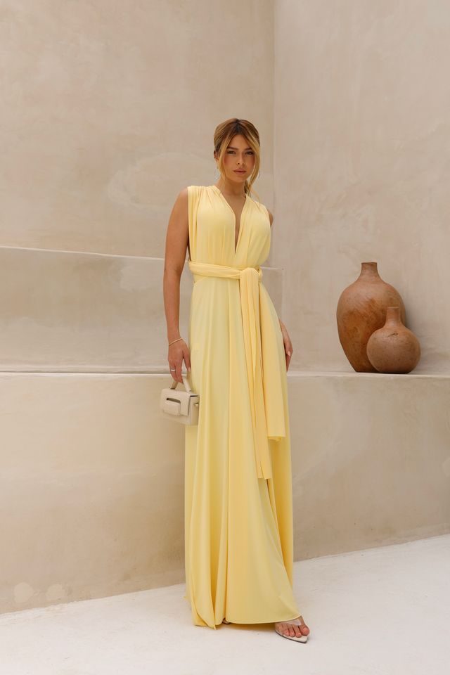 Vestido longo em tecido Fluity, com decote V e decote nas costas com elástico e alça multifuncional, permitindo diferentes formas de amarração para variar o estilo conforme a ocasião.