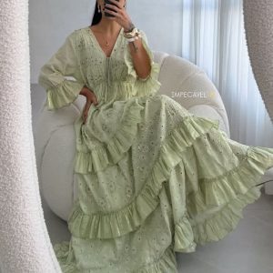 Vestido em viscose com laise e bordados no crochê, decote V, manga 7/8 bufante.