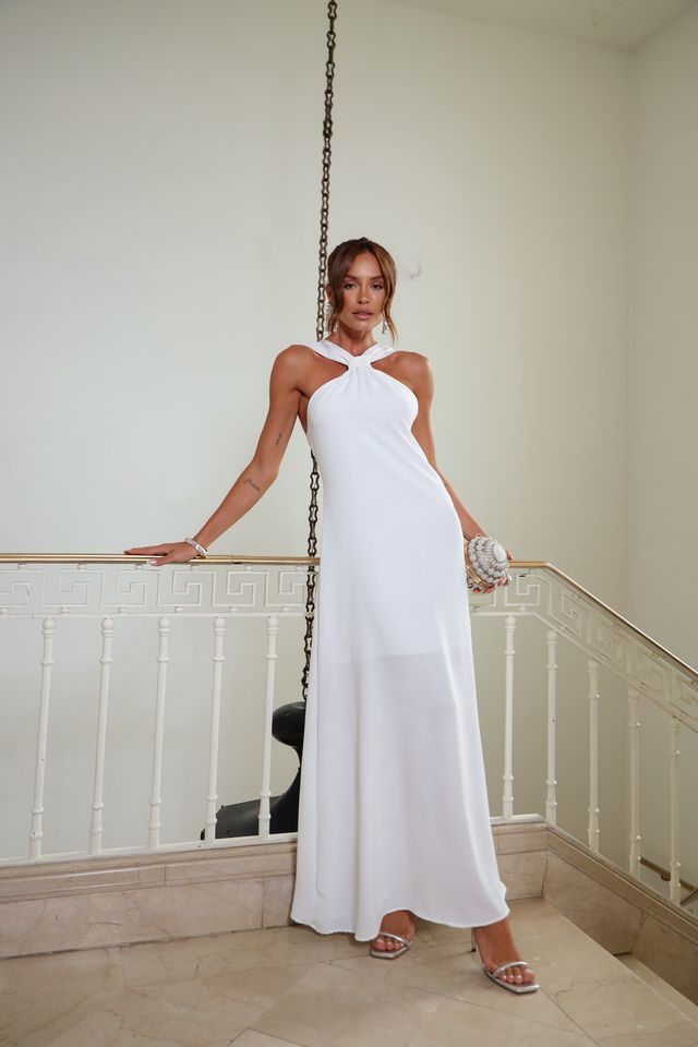 Vestido longo em Duna Air Flow, modelo regata com alças largas e elástico nas costas.