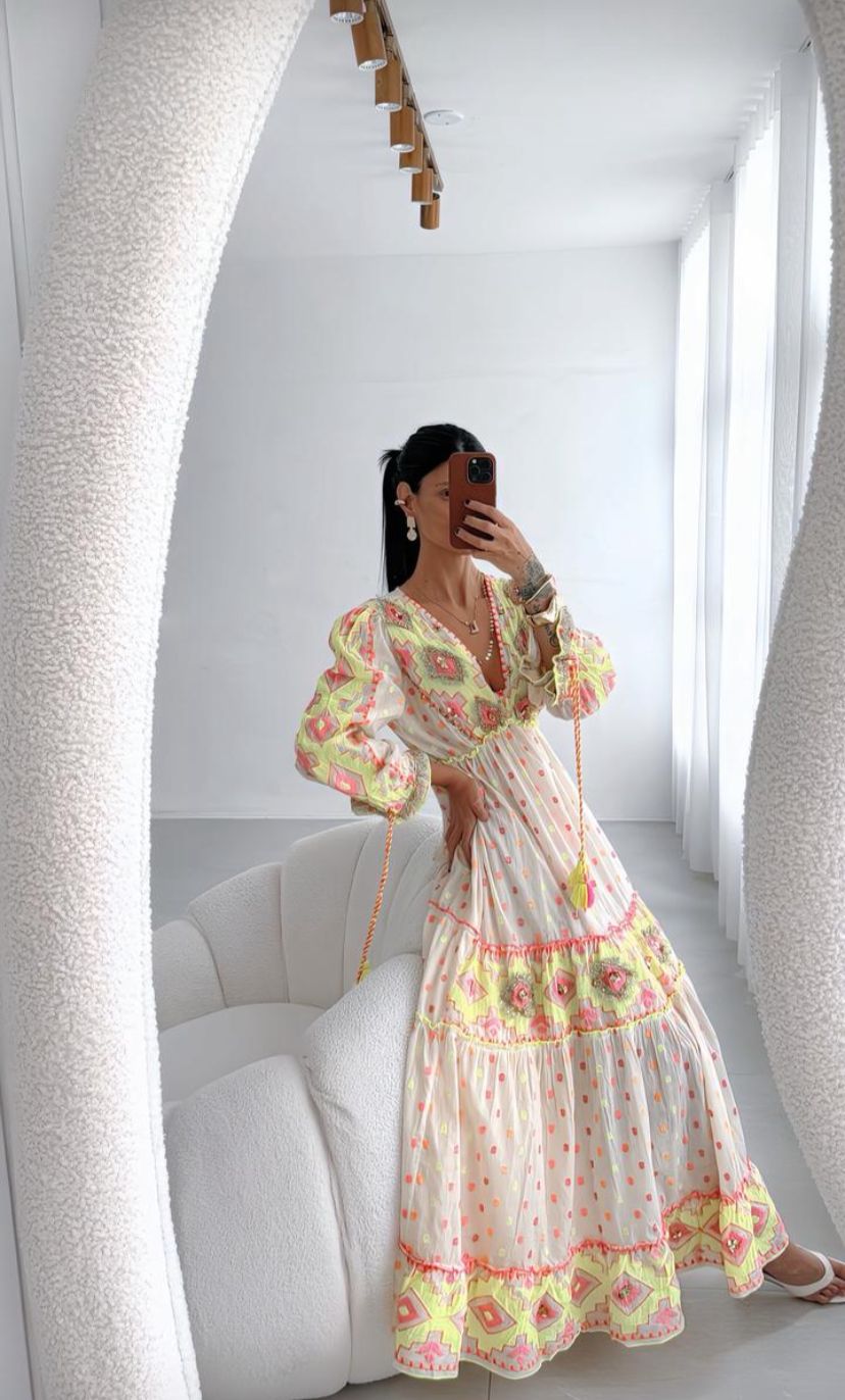 Vestido em Algodão com forro todo bordado , decote V, manga bufante com amarração.