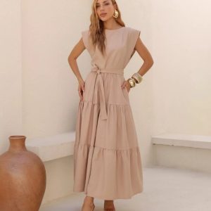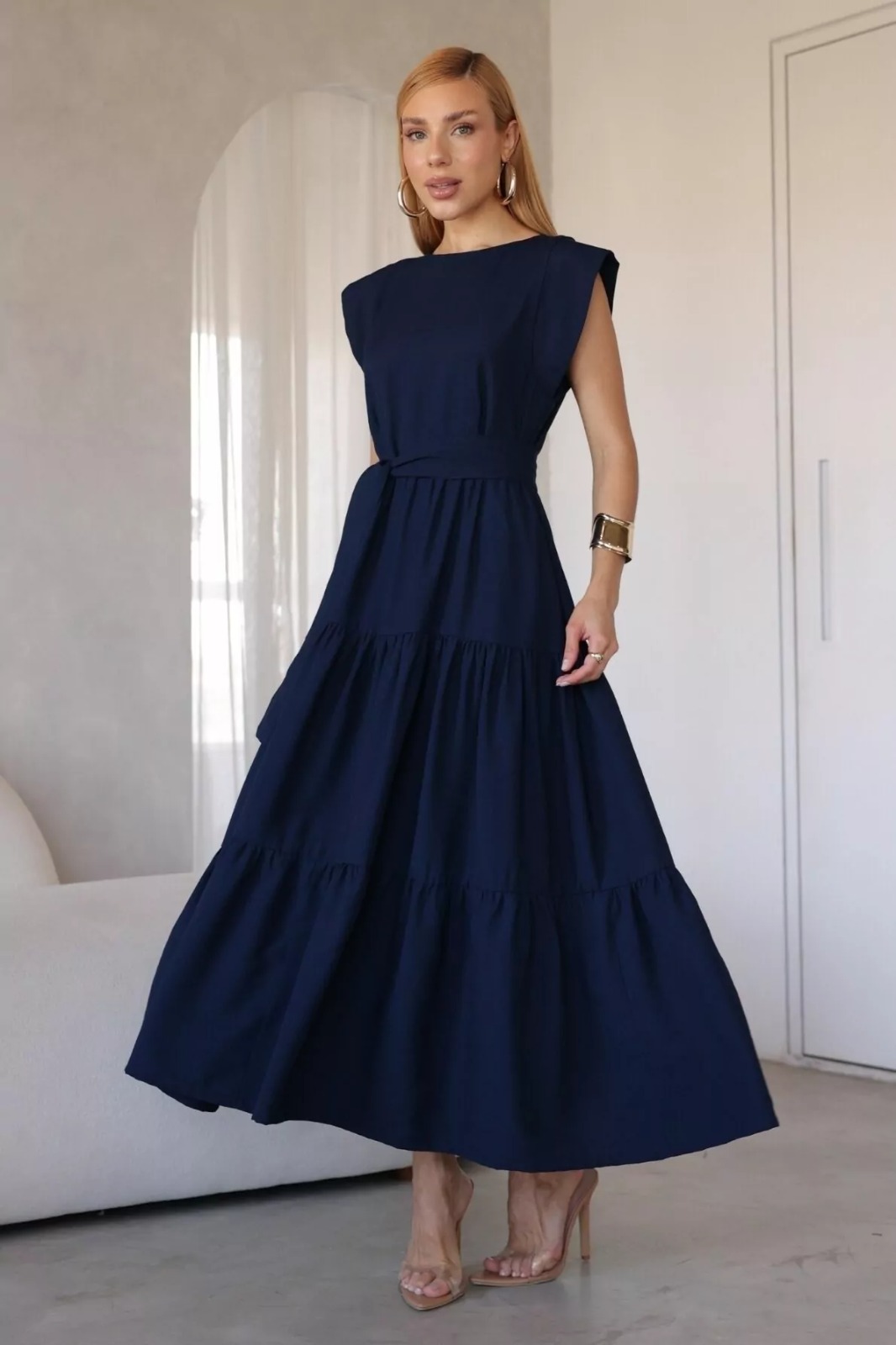 Vestido longuete em Alfaiataria Dominique, com manga japonesa, modelo três maria, cinto do próprio tecido para amarração e fechamento por zíper.