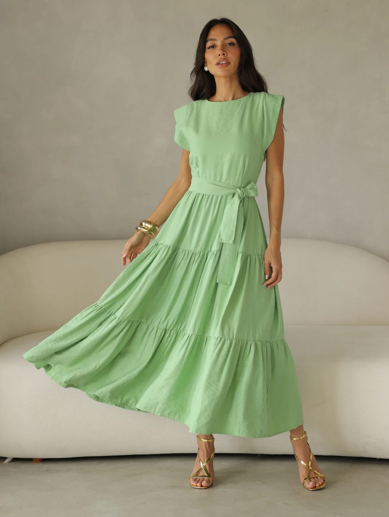 Vestido longuete em Alfaiataria Dominique, com manga japonesa, modelo três maria, cinto do próprio tecido para amarração e fechamento por zíper.