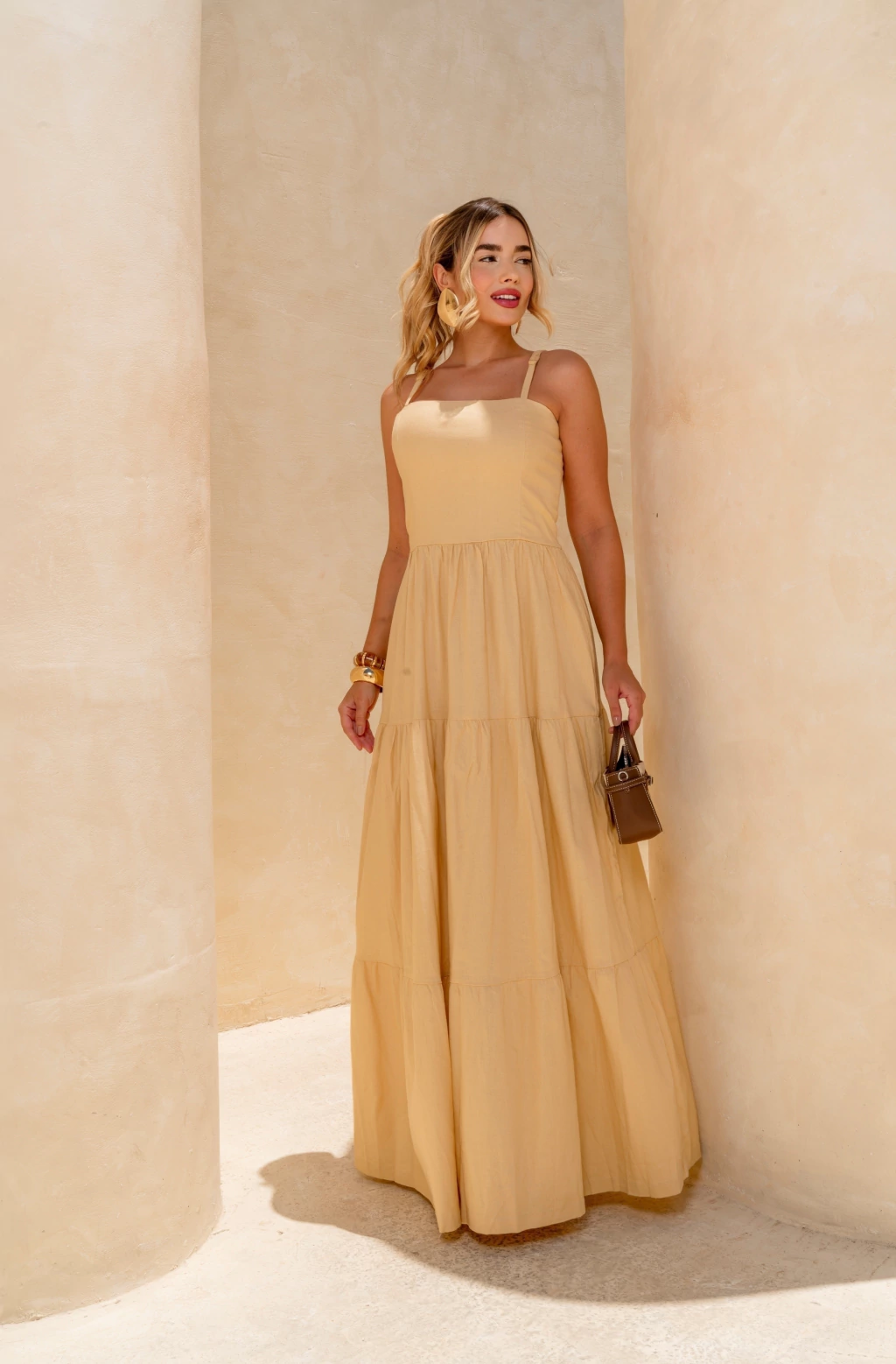 Vestido longo em linho, alça fina com regulável e amarração nas costas.