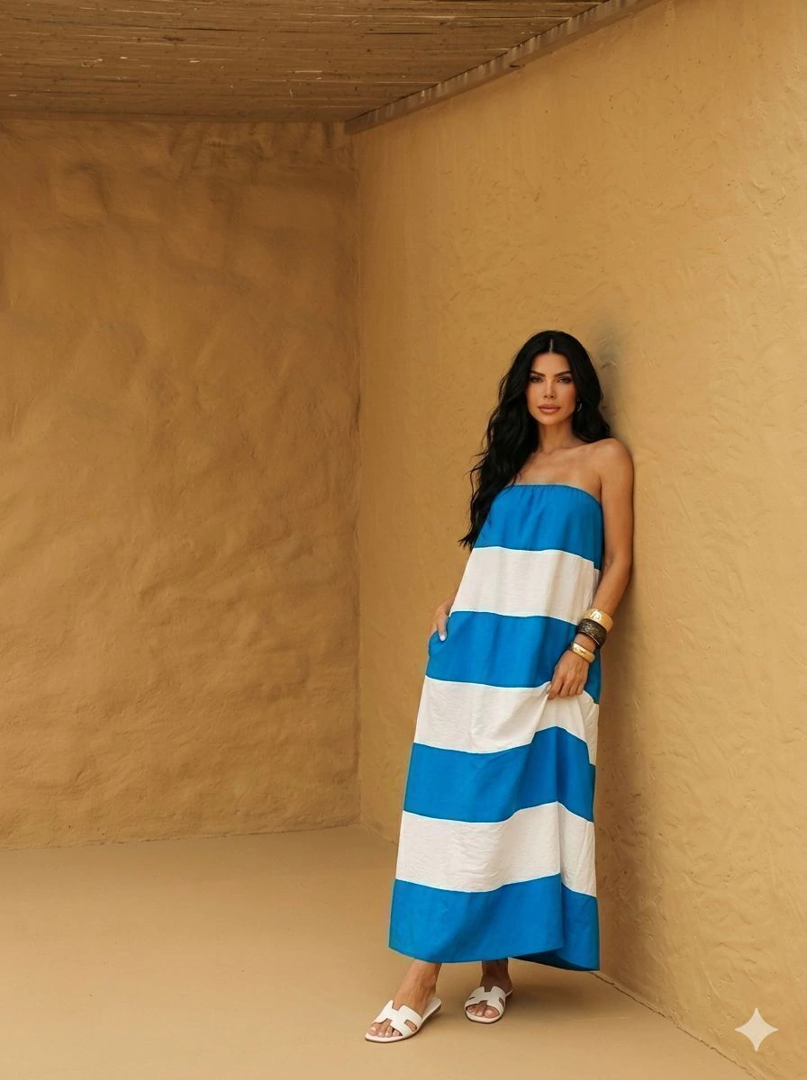 Vestido longo em Alfaiataria Marrrant, tomara que caia com elástico no decote e bolsos laterais.