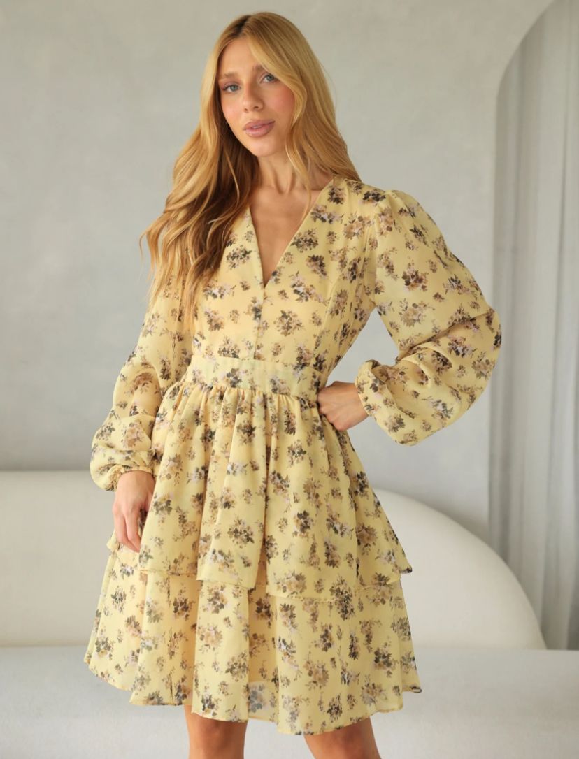 Vestido em Chiffon, com manga longa bufante , elástico no punho, decote V, saia duas marias e fechamento por zíper nas costas.