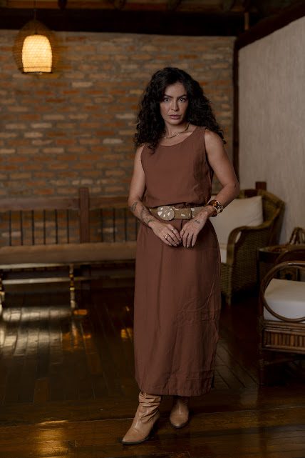 Vestido midi em Alfaiataria Marrant, com gola redonda, bolso frontal e fenda lateral.