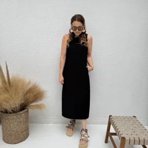 Vestido midi em Alfaiataria Marrant, com gola redonda, bolso frontal e fenda lateral.