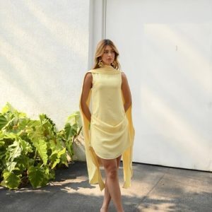Vestido em Fluity, gola alta, com saia drapeada e forro interno.