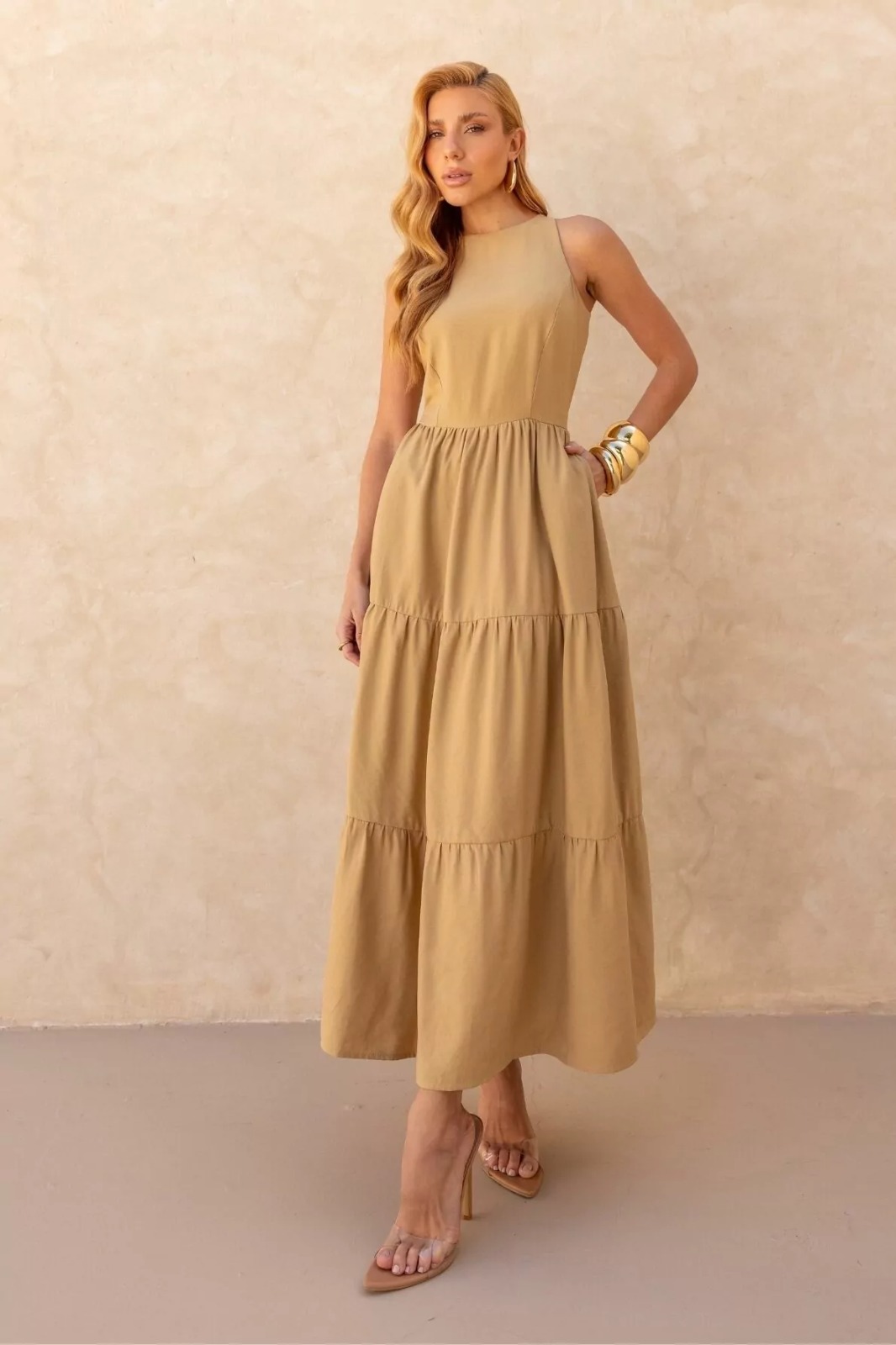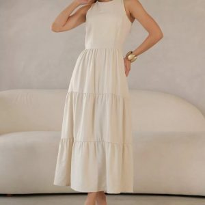 Vestido em Alfaiataria, comprimento midi, decote nadador, saia três marias com fechamento por ziper.
