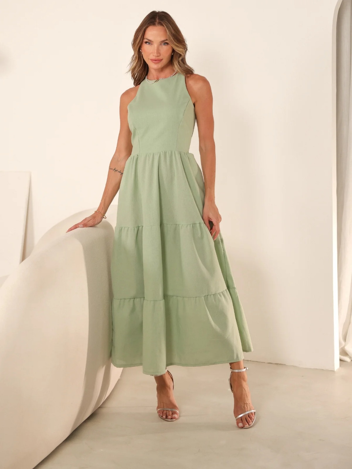 Vestido em Linho, comprimento midi, decote nadador, saia três marias com fechamento por ziper.