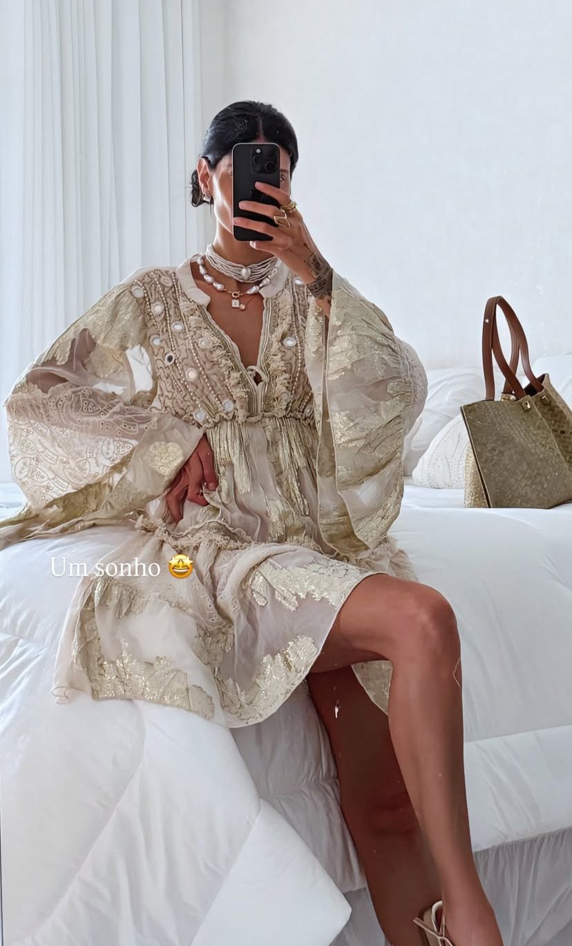 Vestido em algodão com lurex e bordados, manga flare, decote V e amarração no decote.