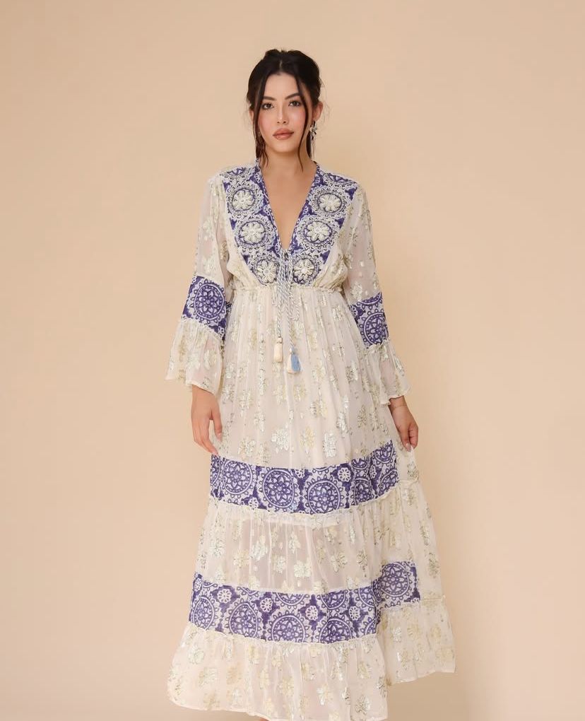 Vestido em algodão forrado, com fios de lurex, bordados com pedraria.