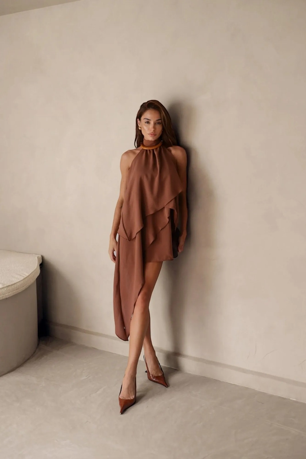 Vestido em Duna Air Flow, com amarração no pescoço por faixa fixas, modelo assimétrico com camadas e elástico nas costas.