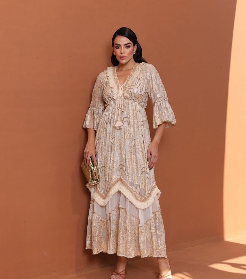 Vestido em algodão forrado, com lurex, bordado e franjas. Manga 7/8, com elástico na cintura , decote v e amarração no decote.
