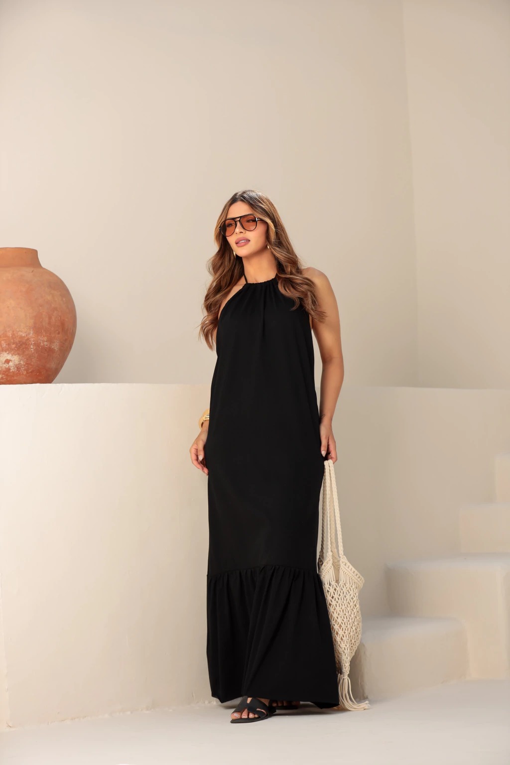 Vestido longo em algodão, frente única com amarração no pescoço, elástico nas costas e babado na barra.
