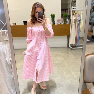 Vestido em linho, modelo ombro a ombro com elastico, manga bufante e fechamento por botão.