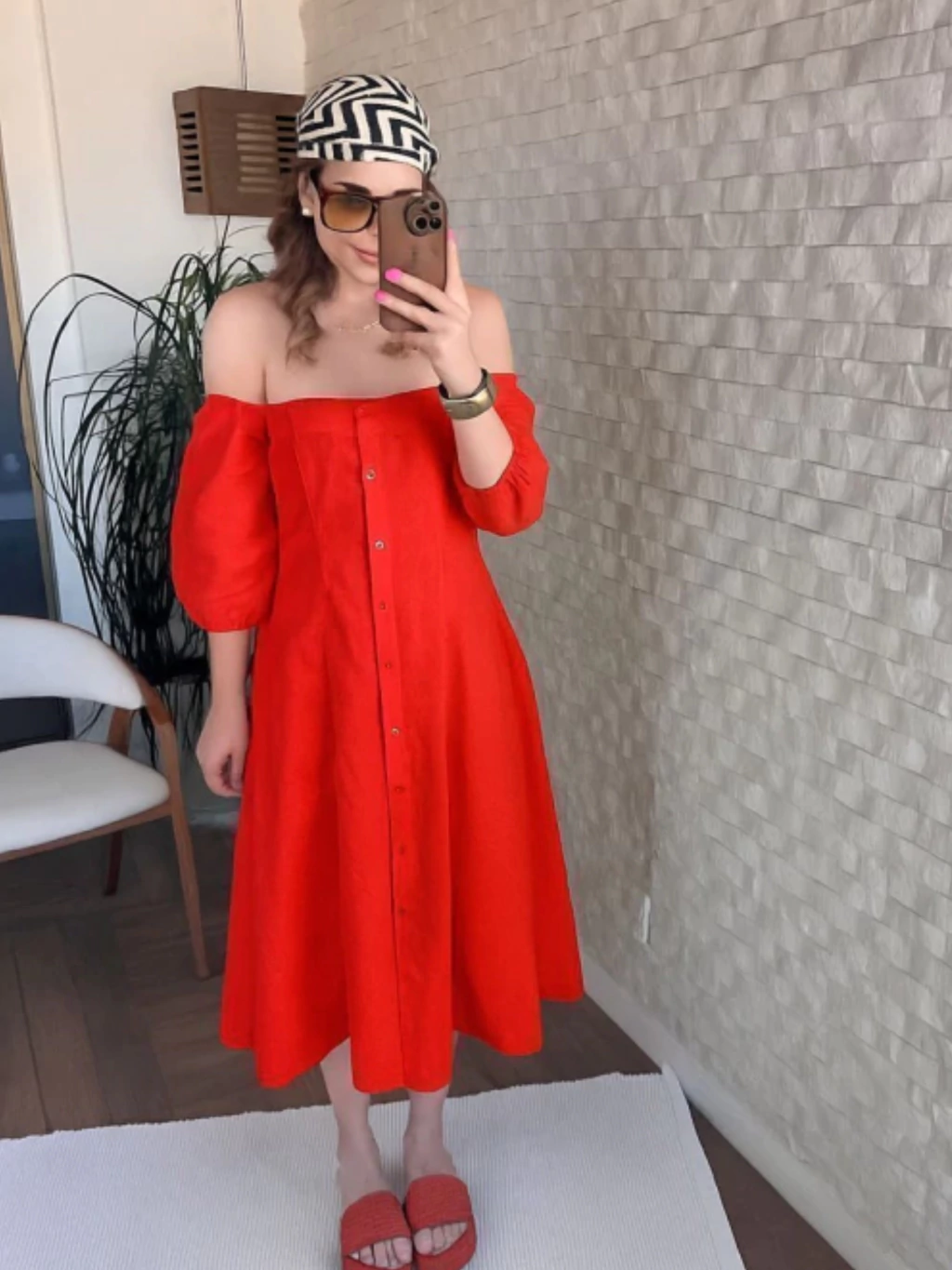 Vestido em linho, modelo ombro a ombro com elastico, manga bufante e fechamento por botão.