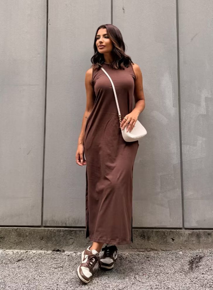 Vestido em algodão, comprimento longuete com bolso e fenda.