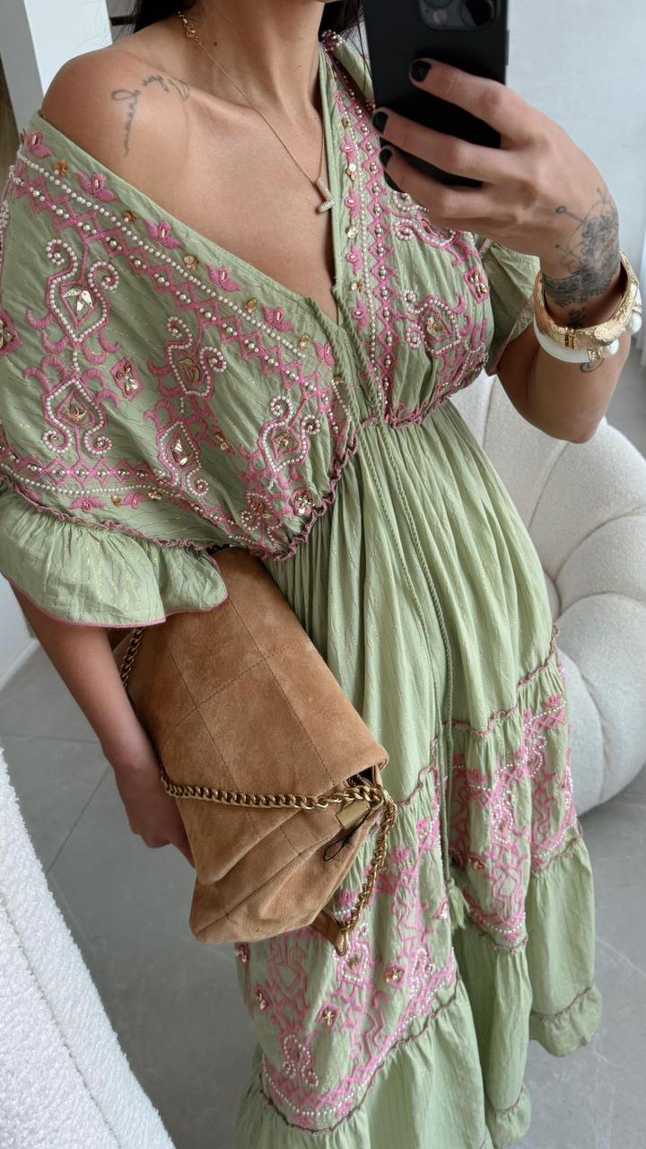 Vestido em viscose bordado com pérolas, decote V e manga 3/4.
