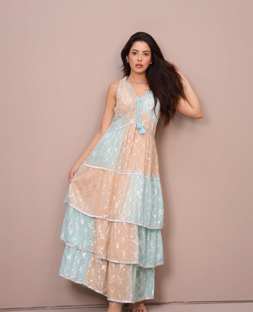 Vestido em algodão forrado e bordado, decote V, com elástico na cintura, babados e amarração no decote.