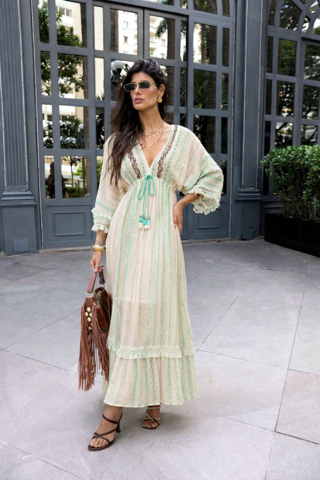 Vetaeido em algodão forrado, bordado a mão. Comprimento longo, manga 7/8, elástico na cintura, decote V e amarração.