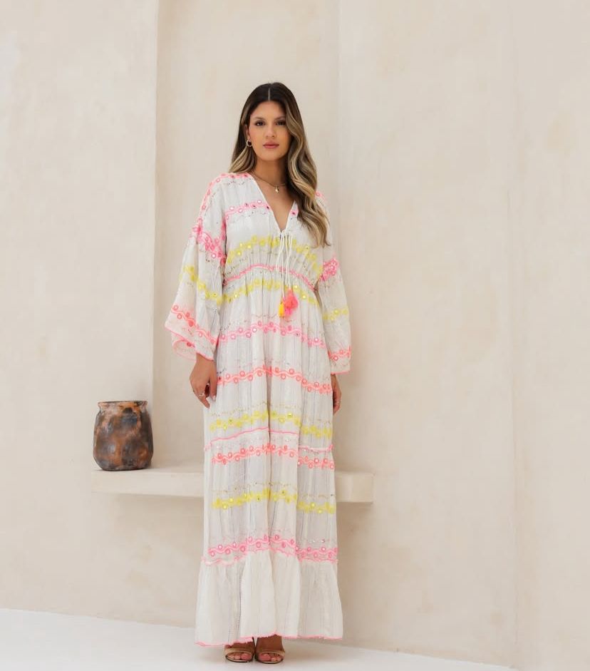 Vestido em algodão forrado e bordado, manga 7/8 assimétrica, decote V e elástico na cintura.