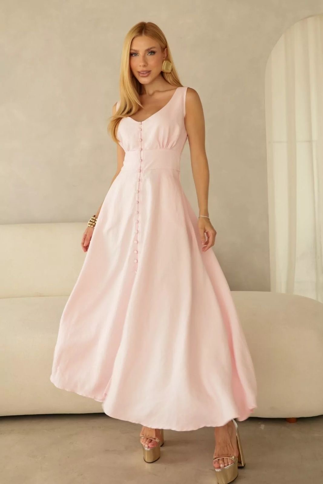 Vestido em Alfaiataria Dominique, comprimento midi, decote V, botões forrados e lastex nas costas.