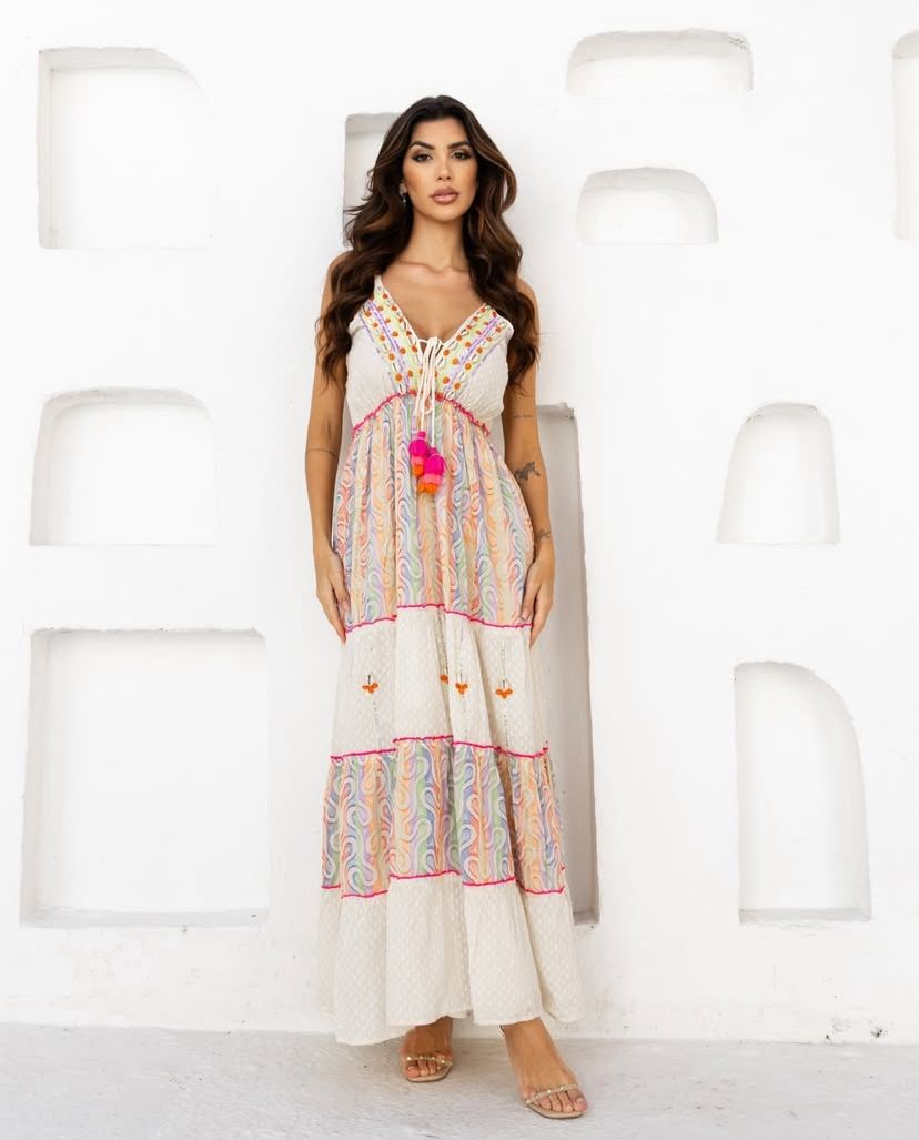 Vestido em algodão forrado e bordado, comprimento longuete, decote V e elástico nas costas.