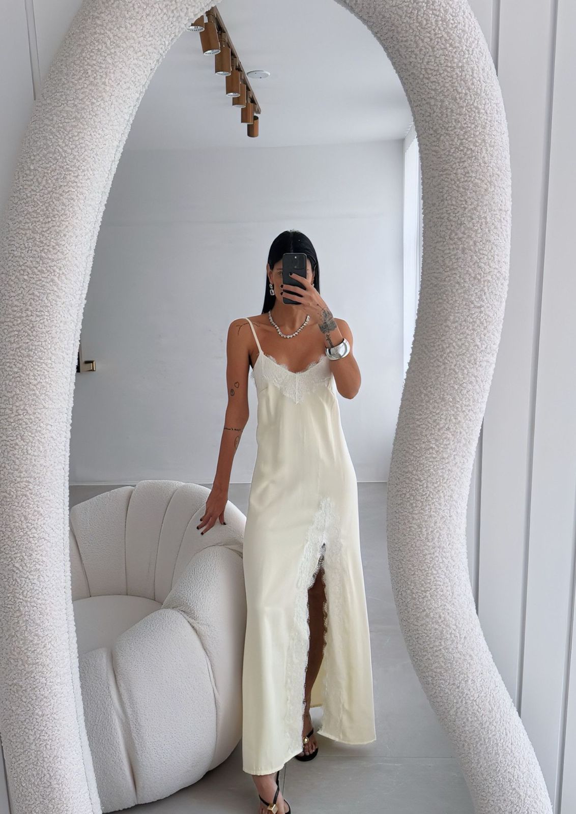 Vestido em crepe com renda chantilly, comprimento longo, decote V, elastico nas costas e fenda lateral.