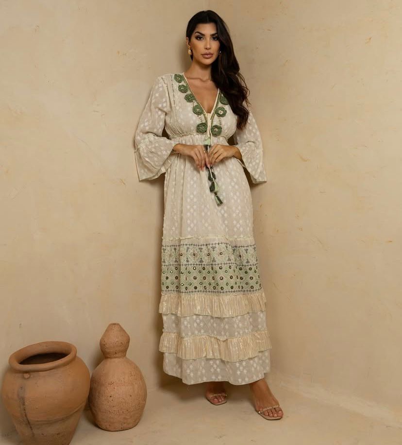Vestido em algodão forrado, bordado e com flores de crochê, com elástico na cintura, comprimento longo, manga 7/8 e decote V.