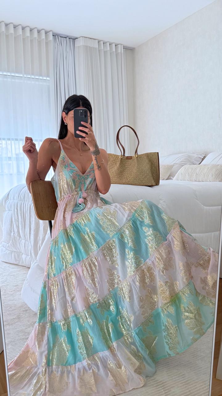 Vestido em algodão com lurex e bordados feitos a mão. Decote V, com alças finas, lastex nas costas e amarração no decote com Pompom.