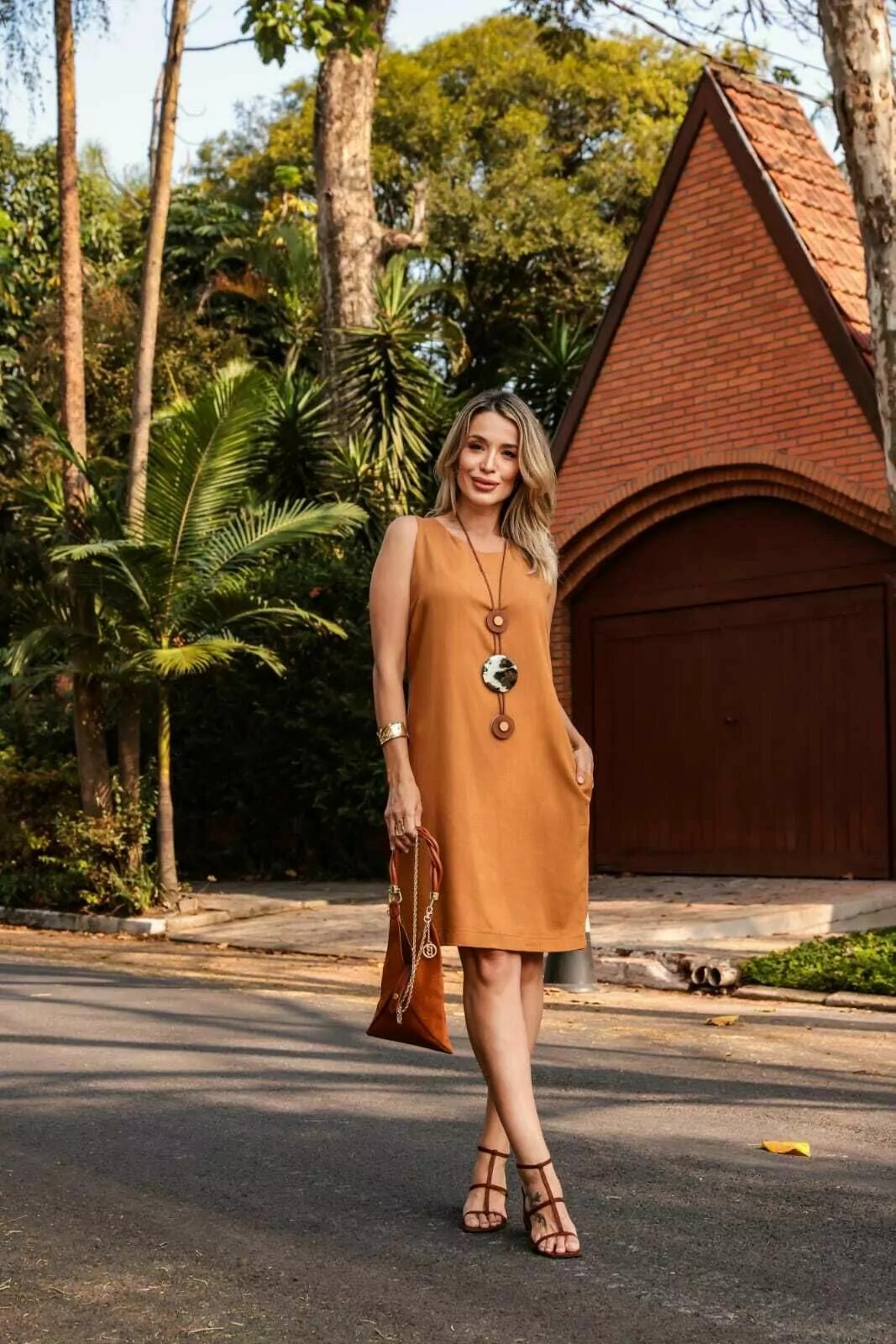 Vestido em Linho, manga regata e bolso frontal.