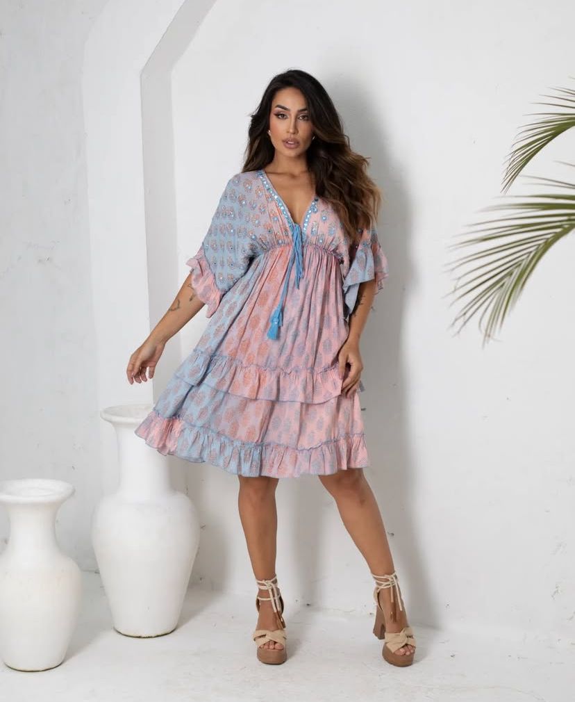 Vestido em algodão bordado a mão, decote V com amarração e manga morcego.
