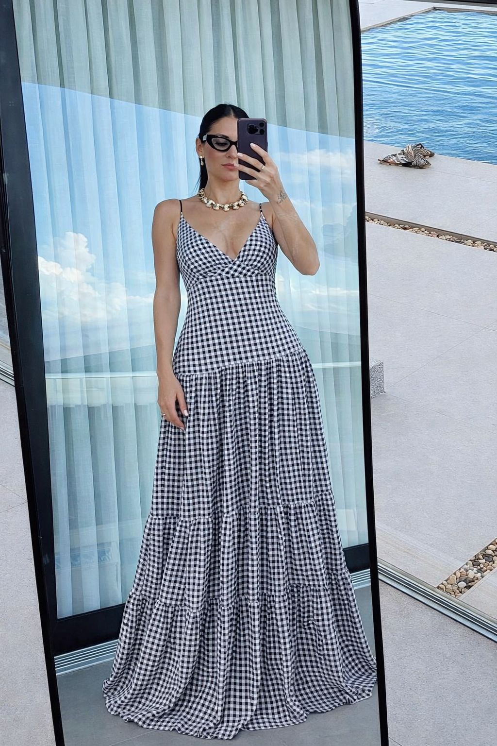 Vestido em crepe de seda, estampa xadrez vichy, comprimento longo , alcinha e decote transpassado.