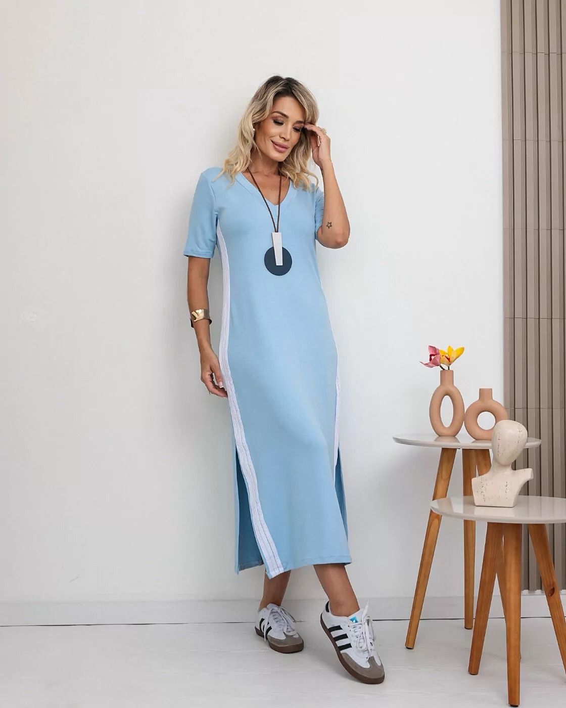Vestido em Moletinho, manga curta, decote V e listras na lateral.