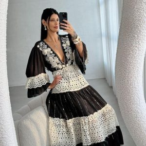 Vestido em laise bordado, decote V ,manga bufantecom babado e forro.