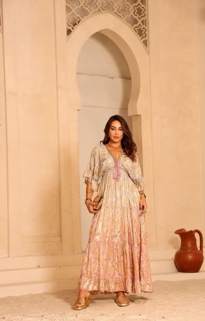 Vestido em algodão forrado e com lurex, decote V, elástico na cintura e bordado.