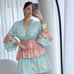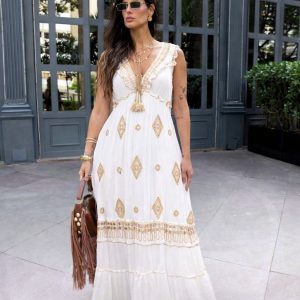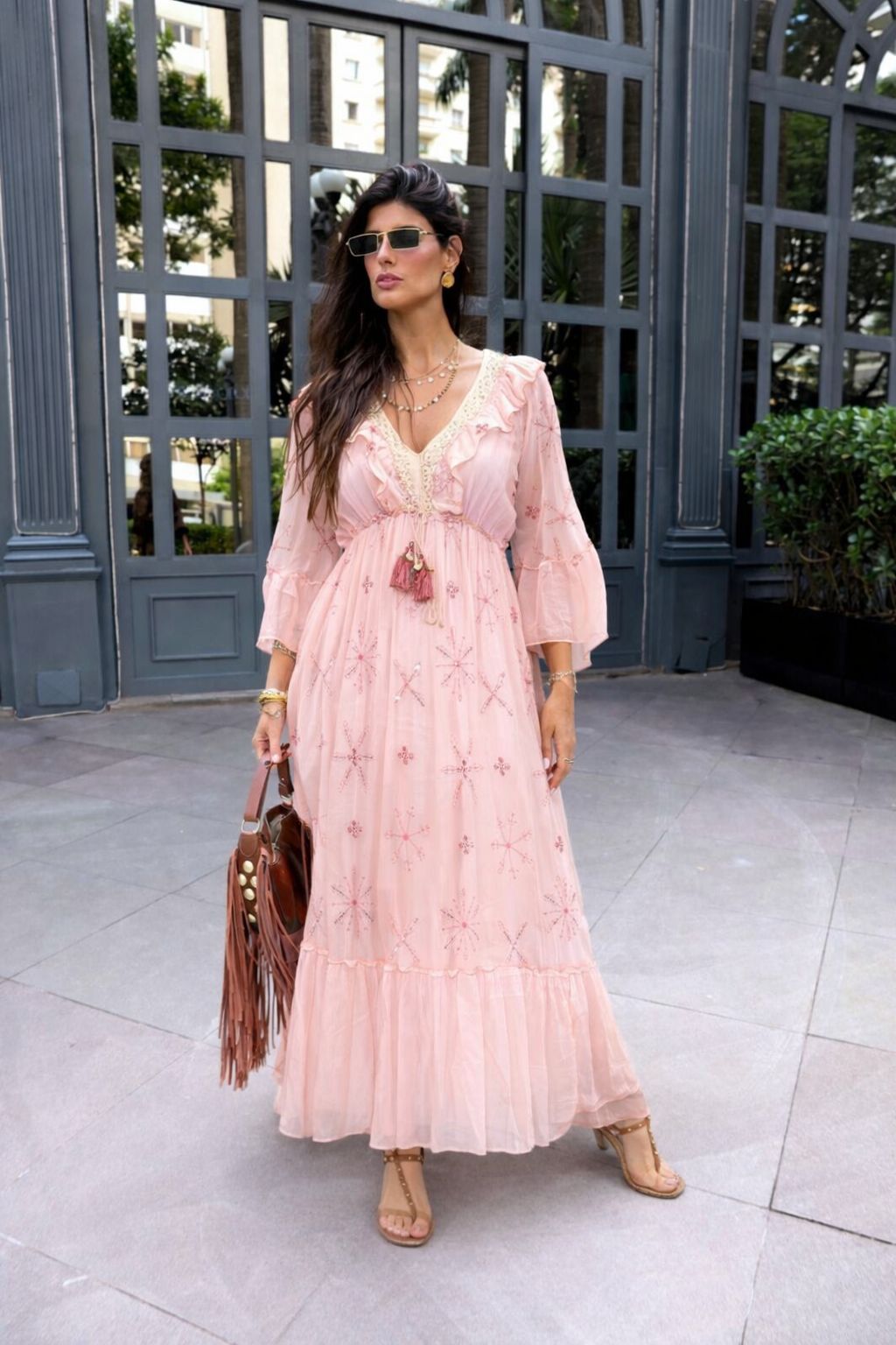 Vestido em algodão forrado, com bordados e renda. Comprimento longo, manga 7/8, decote V, elástico na cintura e amarração.