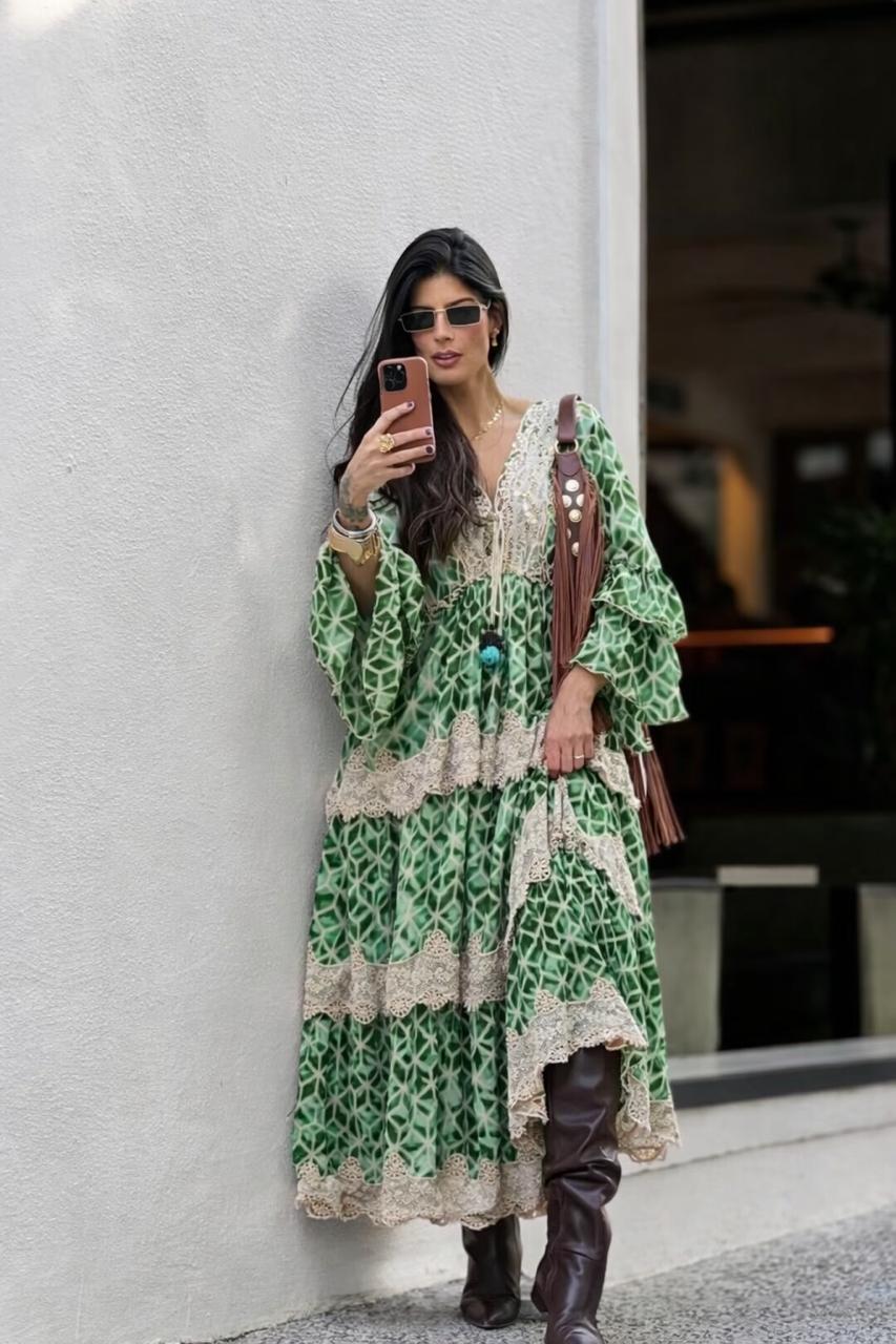 Vestido em algodão com forro e renda guipir, manga 7/8 com babado e decote V.