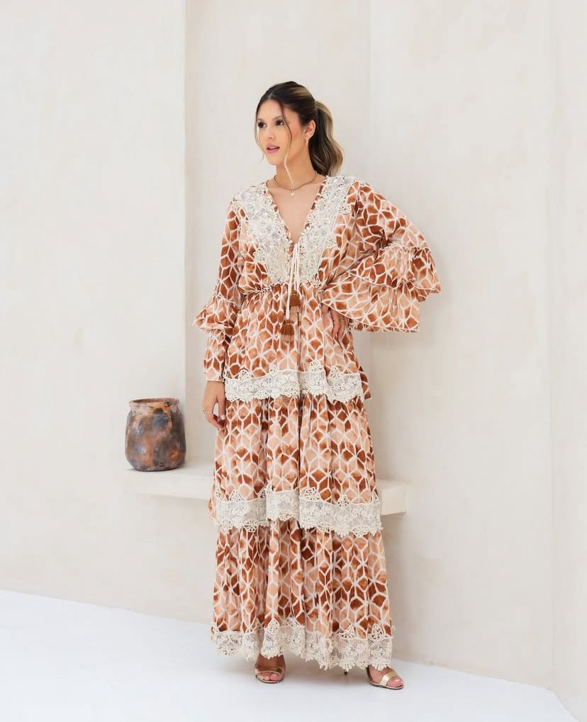 Vestido em algodão com forro e renda guipir, manga 7/8 com babado e decote V.