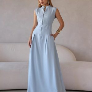 Vestido longo em Alfaiataria Dominique, modelo regata, com zíper e bolso frontal.