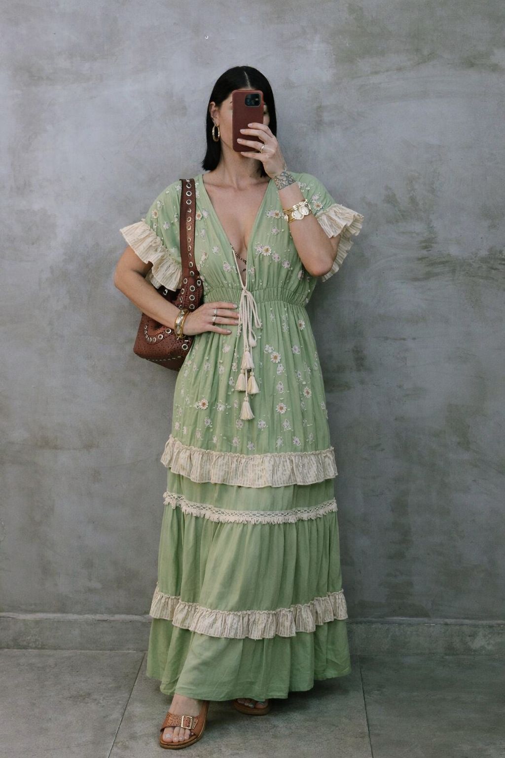 Vestido em algodão forrado e bordado a mão. Comprimento longo, com babados, decote V, elástico na cintura e amarração.