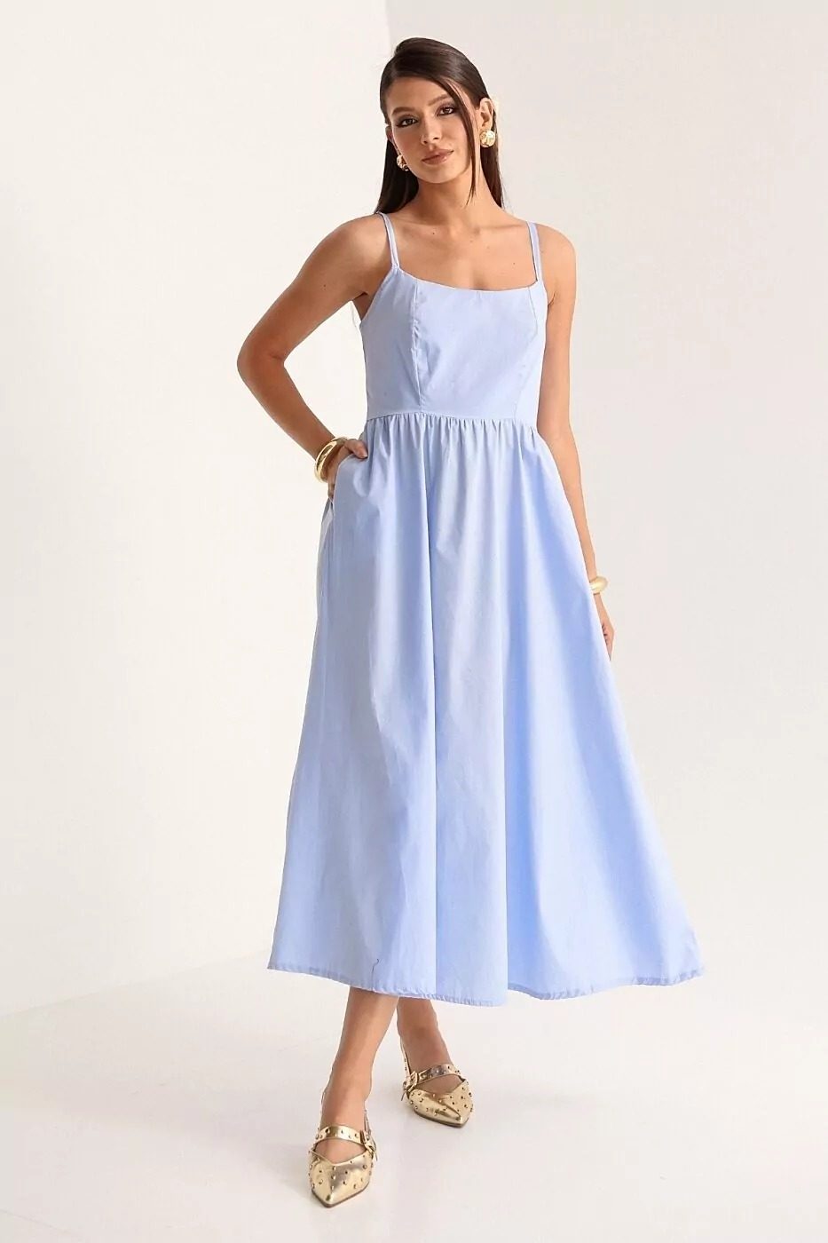 Vestido em Tricoline, com alça fina reguláveis e fechamento por zíper nas costas.