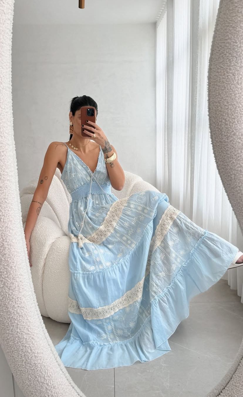 Vestido em viscose bordado, comprimento longo, com renda, decote V e alça fina com ajuste.